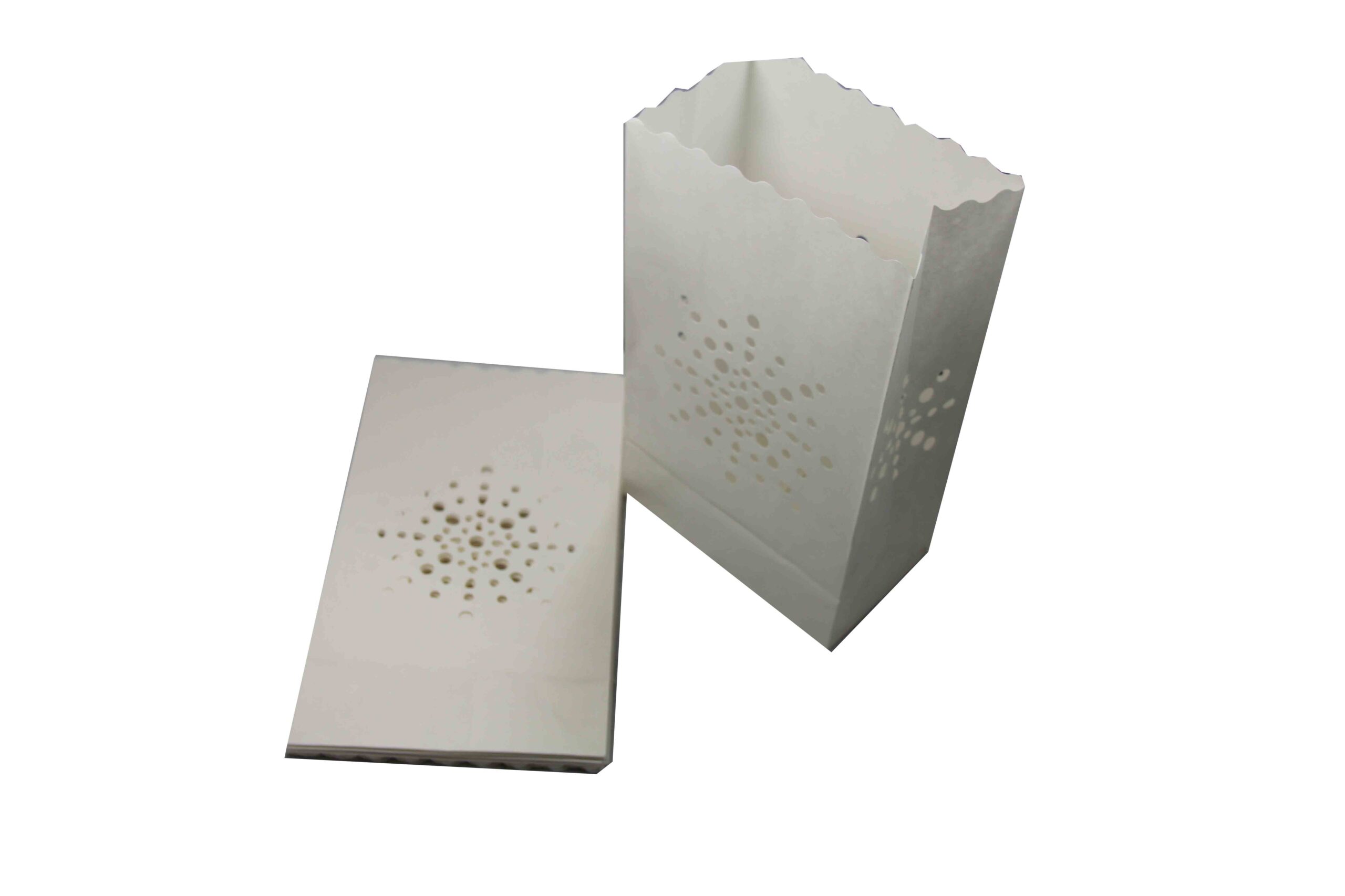 High quality luminaria candle bags with beautiful side designs to reflect patterns of light. Candlelight shines through the stars of this set of 10 11 1/2 inch high x 6 inch wide paper bags. Luminaries require sand in the base to support a votive candle (sand and candles not included). Environmentally friendly bio-degradable white bags. You are purchasing a pack of 10 bags.